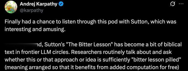 AndrejKarpathy首先点明了一个背景:Sutton的“苦涩教训”(TheBitterLesson)一文,如今已成为前沿LLM圈子里的“圣经”。研究者们会经常讨论某个方法或想法是否足够“bitterlessonpilled”(意即一个方法能够随着算力的增加而自然受益),以此作为判断其是否有效或值得追求的依据